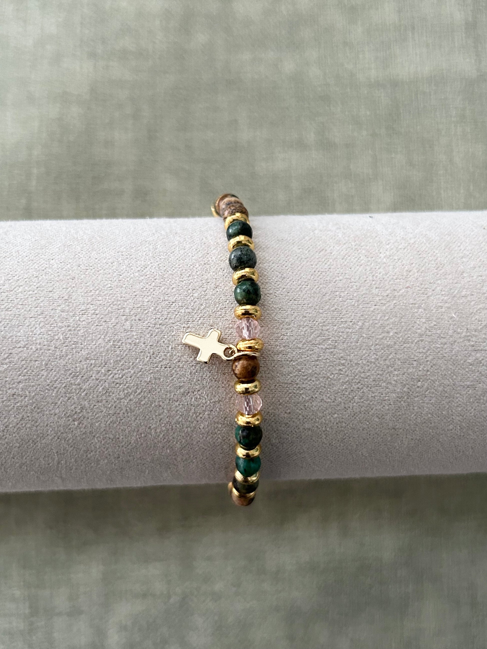 Elevate your daily ensemble with a piece that represents your faith and can go with anything in your closet! This bracelet features a thoughtful blend of natural stone beads in a variety of colours, accented by elegant gold-toned spacers. The centerpiece is a delicate, polished gold-toned cross charm, serving as a gentle reminder of faith and grace throughout your day.